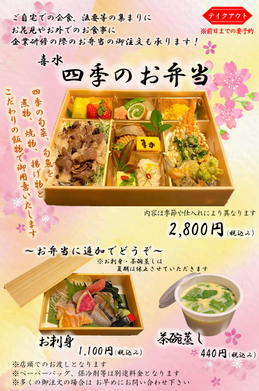 この春はぜひ、お花見の彩り豊かな喜水のお弁当で✧