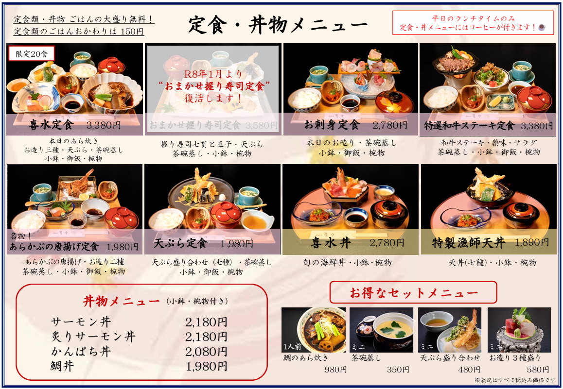 平日の終日・土日祝日の夜の部で御利用いただける定食メニューとなります。